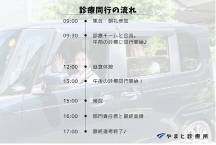 やまと診療所の選考フローは、訪問診療の現場に同行したり、「あなたらしさ」を深く掘り下げる面接をするなど、独自のフローを用意しています。